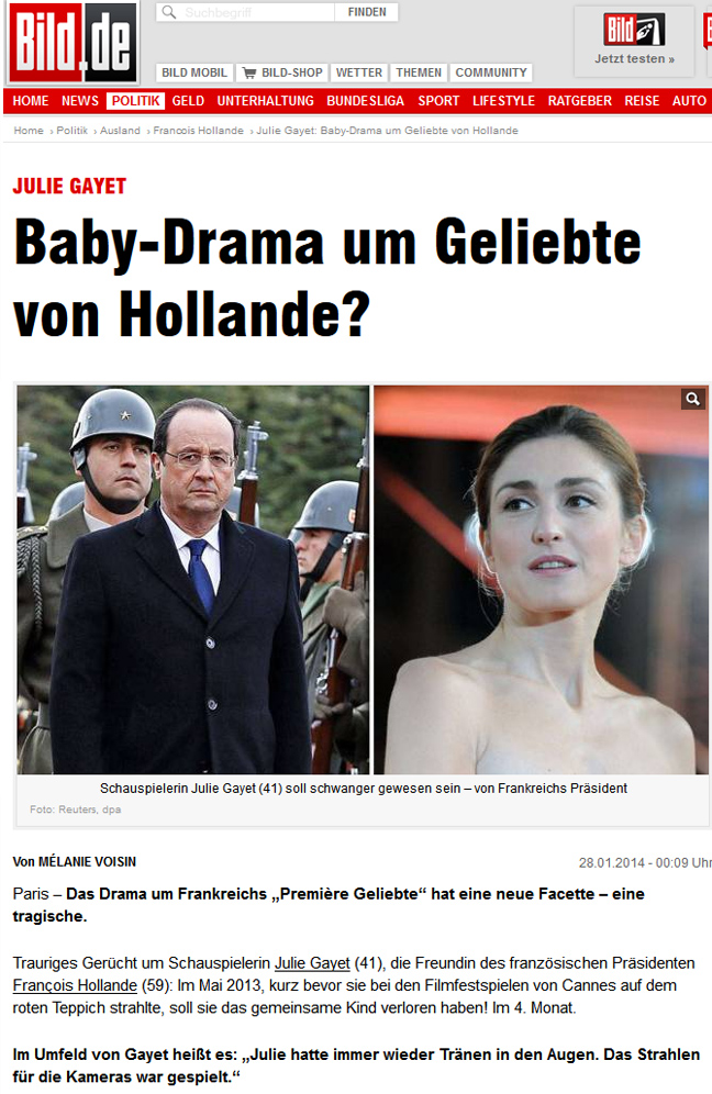 Η γερμανική εφημερίδα αποκαλύπτει ότι η Γαλλίδα ηθοποιός Ζουλί Γκαγέ απέβαλε τον Μάιο του 2013. Το ζευγάρι είχε αυτή την ατυχία, αναφέρει η γερμανική εφημερίδα επικαλούμενη πηγές από το περιβάλλον της Γκαγέ.