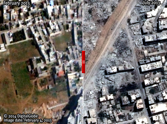 Σύμφωνα με την οργάνωση υπεράσπισης των ανθρωπίνων δικαιωμάτων, το συριακό καθεστώς έχει κατεδαφίσει από τον Ιούλιο 2,012 εκατ. κτίρια σε μία έκταση 1.450 στρεμμάτων, που αντιστοιχεί σε 200 γήπεδα ποδοσφαίρου. Μεταξύ των κατεδαφισθέντων περιλαμβάνονται και πολλά πολυώροφα συγκροτήματα διαμερισμάτων.