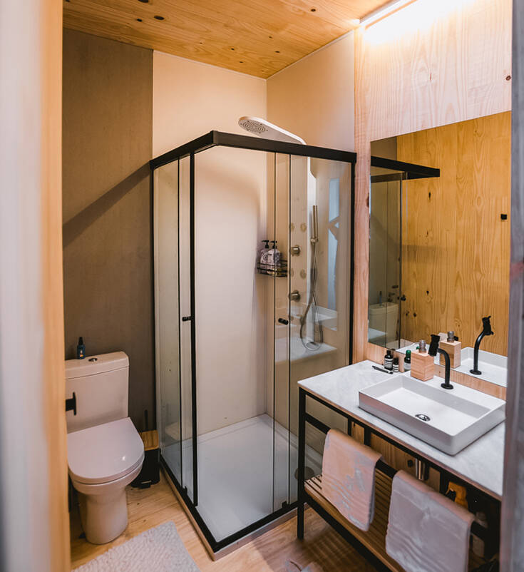 Το σπίτι είναι αυτόνομο, διαθέτοντας ηλιακά πάνελ, φυσικό εξαερισμό και σταθμό επεξεργασίας πόσιμου νερού και διαχείρισης λυμάτων.