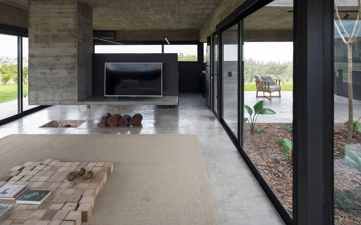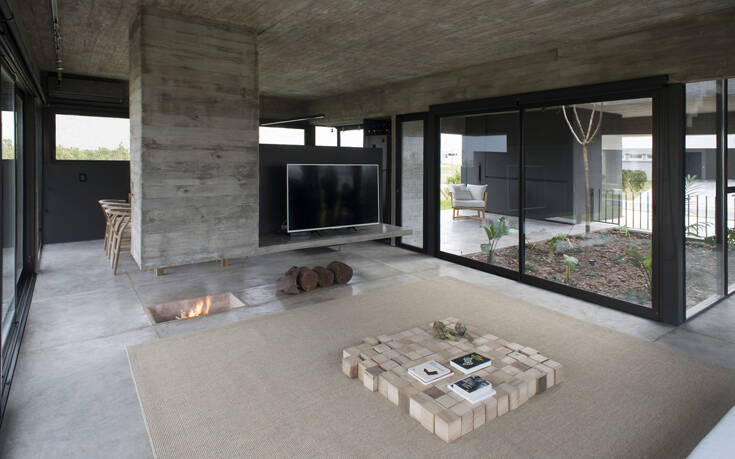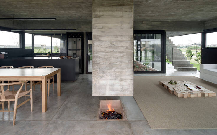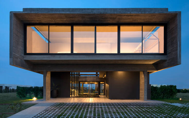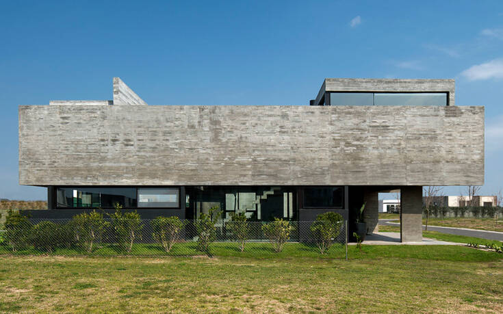 Ένας μεγάλος και ορθογώνιος όγκος από τσιμέντο που πατάει σε τέσσερα πόδια είναι ουσιαστικά, ντύνοντας τα κενά με τζαμαρίες.