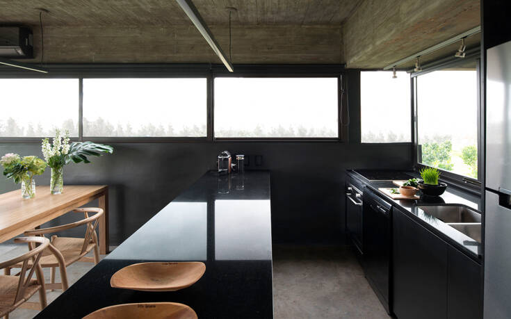Το παιχνίδισμα αυτό με τα τζάμια δημιουργεί την ψευδαίσθηση ότι ο επάνω όροφος επιπλέει στον χώρο, λες και δεν ακουμπά πουθενά.