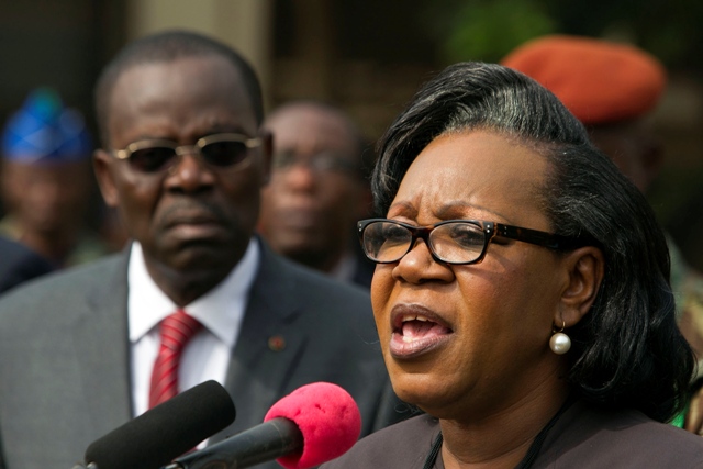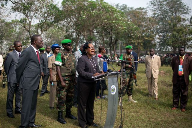 Λίγα λεπτά νωρίτερα, η νέα μεταβατική πρόεδρος της χώρας, Κατρίν Σαμπά Πανζά, είχε απευθύνει ομιλίας σε τουλάχιστον 1.000 στρατιώτες, δηλώνοντας πως είναι «υπερήφανη» γιατί συγκεντρώθηκαν στην τελετή «τόσα πολλά μέλη των ενόπλων δυνάμεων».
