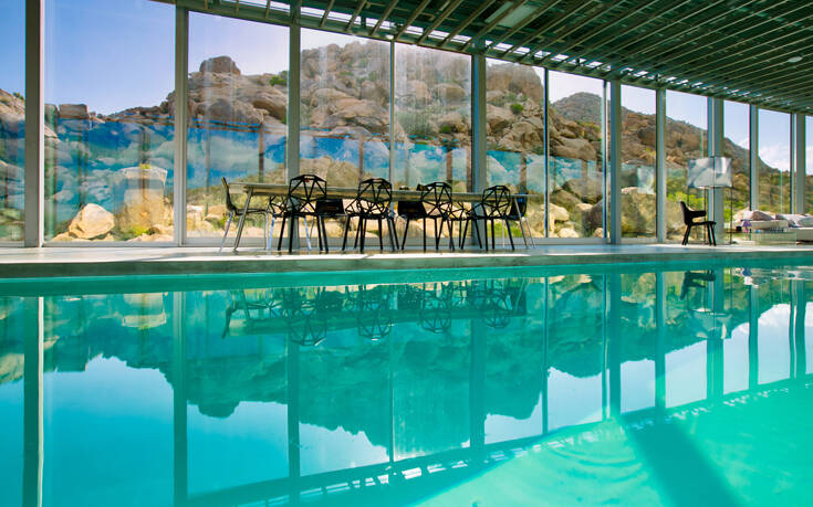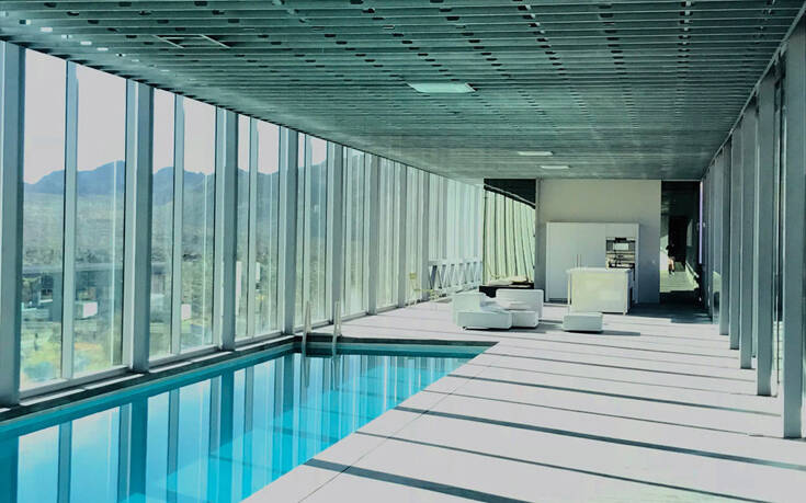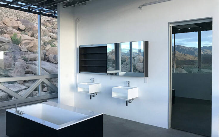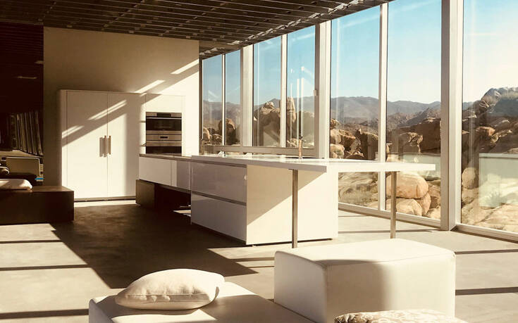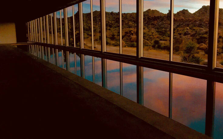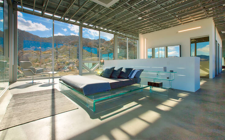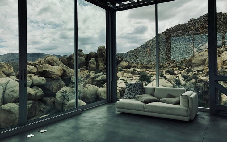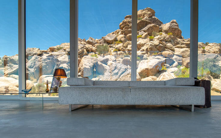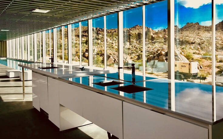 Χαμένο μέσα σε μια ιδιωτική έκταση 90 στρεμμάτων στο Joshua Tree National Park της νότιας Καλιφόρνια, στο εσωτερικό επικρατεί ένας τελείως διαφορετικός αέρας. Εδώ τον πρώτο λόγο αναλαμβάνει ο μινιμαλισμός και αυτή η θεόρατη πισίνα μήκους 30 μέτρων.