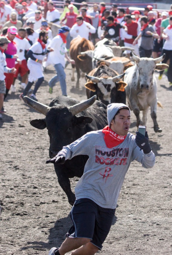 Η φωτογραφία τραβήχτηκε στις 25 Ιανουαρίου κατά τη διάρκεια του Great Bull Run, που διοργανώθηκε στο Baytown του Τέξας. Στο πλαίσιο της διοργάνωσης, 48 ταύροι αφήνονται ελεύθεροι και κυνηγούν εκατοντάδες ανθρώπους που συμμετέχουν, όπως αναφέρει η Huffington Post.