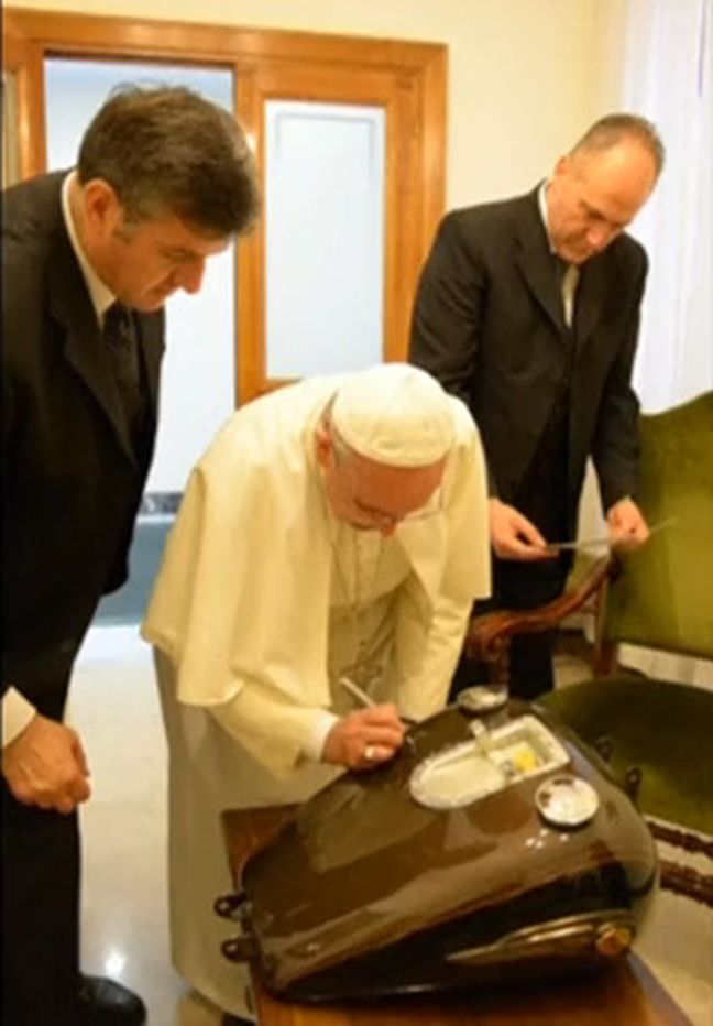 Τον περασμένο Ιούνιο και με αφορμή του εορτασμού των 110 χρόνων από την ίδρυση της διάσημης εταιρίας, η Harley-Davidson είχε δωρίσει τη συγκεκριμένη μηχανή στον πάπα Φραγκίσκο που με τη σειρά του την είχε παραχωρίσει στην «Caritas».