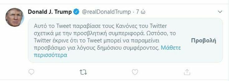 Το twitter τοποθέτησε προειδοποιητική σήμανση σε μια ανάρτηση του προέδρου των ΗΠΑ Ντόναλντ Τραμπ για λόγους παραβίασης της πολιτικής της εταιρείας κατά της καταχρηστικής συμπεριφοράς.