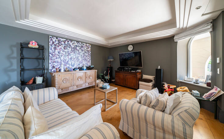 Το μωσαϊκό σε φέρνει ως το θεόρατο εσωτερικό των 1.000 σχεδόν τετραγωνικών μέτρων, που φιλοξενεί 5 υπνοδωμάτια και 5 μπάνια, αλλά και εσωτερική πισίνα, γυμναστήριο, κελάρι, σάουνα, 2 ξενώνες και ξεχωριστά καταλύματα για το προσωπικό.
