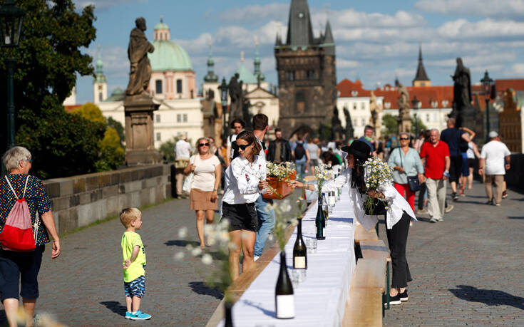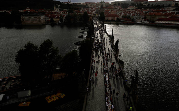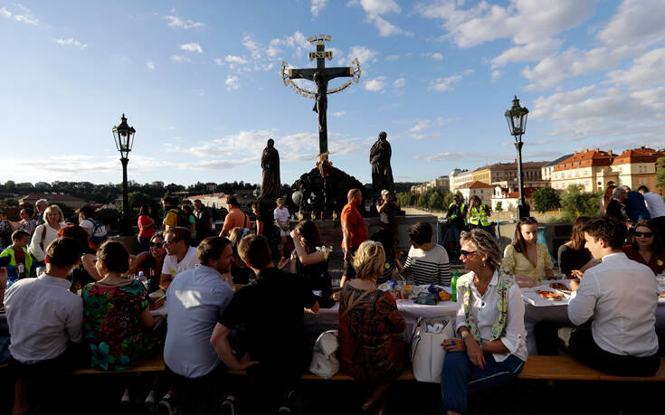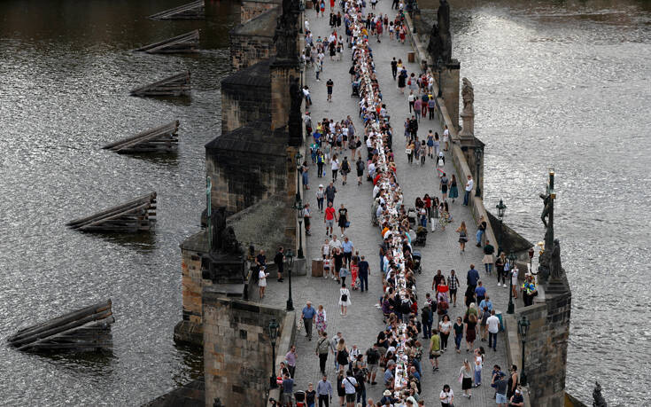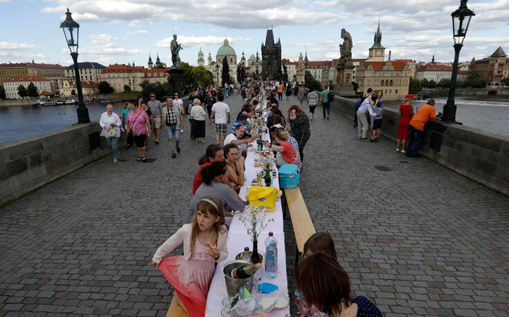 Με ένα μεγάλο γλέντι είπαν οι κάτοικοι της Πράγμας «αντίο κορονοϊέ» την Τρίτη (30/06), καθώς χιλιάδες άνθρωποι κάθισαν σε ένα τραπέζι μήκους 500 μέτρων στη γέφυρα του Καρόλου, προκειμένου να χαρούν την άρση των μέτρων που είχαν ληφθεί στην Τσεχία για τον περιορισμό της πανδημίας.