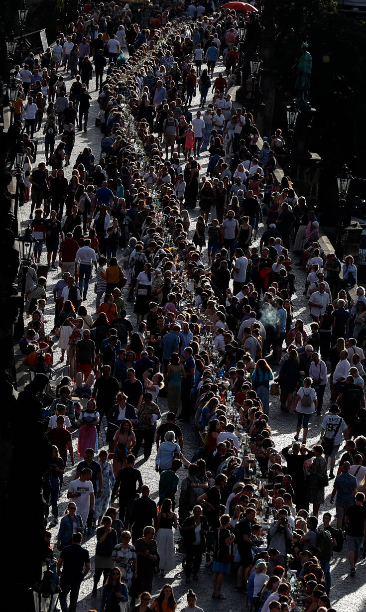 Συνεισφέροντας φαγητό ή ποτό, οι συμμετέχοντες σε αυτό το τραπέζι μοιράστηκαν το γεύμα τους πάνω στη γέφυρα αυτή του 14ου αιώνα, σύμβολο της τσεχικής πρωτεύουσας, την ώρα που μια αυτοσχέδια ορχήστρα έπαιζε μουσική και πολλοί τραγουδούσαν γύρω από ένα τραπέζι στολισμένο με μαργαρίτες.