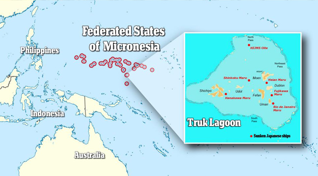 Στο Chuuk Lagoon στον Ειρηνικό Ωκεανό για πάνω από 70 χρόνια βρίσκονται στο βυθό αντικείμενα από τον Β’ Παγκόσμιο Πόλεμο στο μέρος το οποίο θεωρείται το μεγαλύτερο νεκροταφείο πλοίων στον κόσμο. Το 1944, η επιχείρηση Hailstone των ΗΠΑ στην περιοχή είχε ως αποτέλεσμα την καταστροφή 12 Ιαπωνικών πολεμικών πλοίων, 32 εμπορικών πλοίων και 249 αεροσκαφών.
