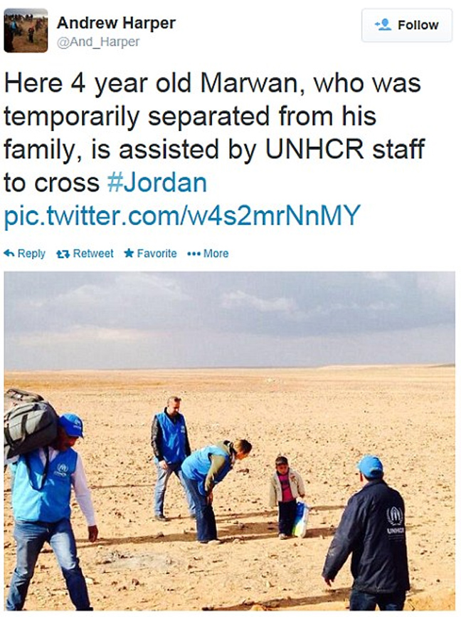 Οι εργαζόμενοι τον βοήθησαν να περάσει τα σύνορα προς την Ιορδανία και σύμφωνα με νεότερο tweet του Harper η οικογένεια του μικρού Marwan εντοπίστηκε και ο μικρός ενώθηκε και πάλι με τη μητέρα του.