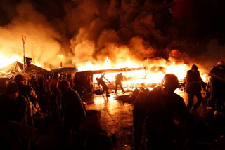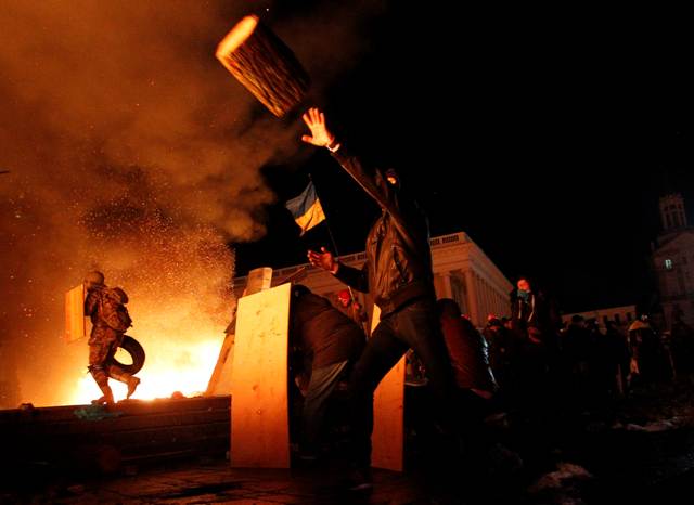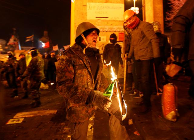 Η ουκρανική τηλεόραση μετέδωσε ότι δύο τεθωρακισμένα άρματα μεταφοράς προσωπικού κινούνται προς την πλατεία Ανεξαρτησίας, στο κέντρο της πρωτεύουσας, και οι διαδηλωτές εκτοξεύουν βόμβες μολότοφ εναντίον τους.