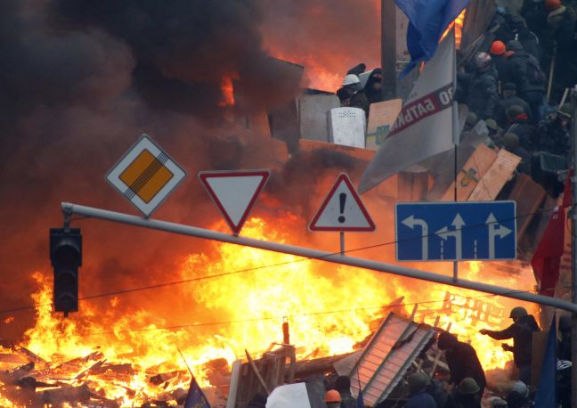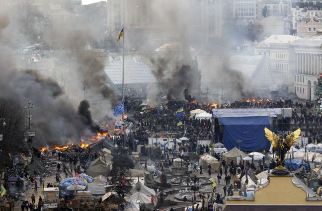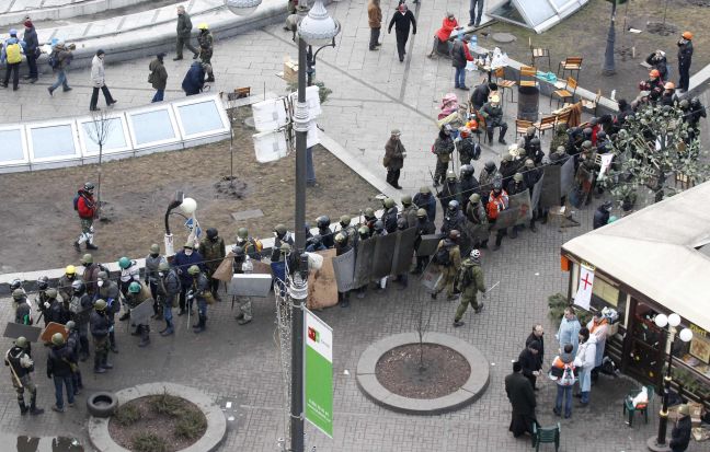 Στην πλατεία Ανεξαρτησίας στο Κίεβο η ατμόσφαιρα μυρίζει μπαρούτι ανάμεσα στους αντικυβερνητικούς διαδηλωτές και την αστυνομία που προσπαθεί να εκκενώσει την πλατεία από αυτούς.