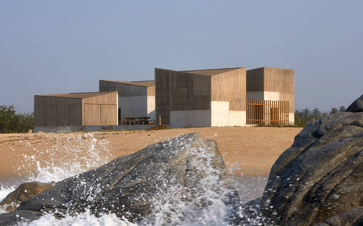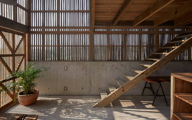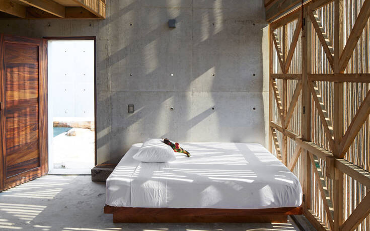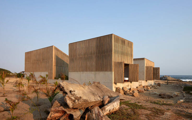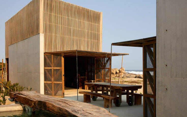 Όλα εδώ είναι ντυμένα στο ξύλο, όπως αυτός ο φοίνικας των πάνελ της πρόσοψης, που παραπέμπει στις παραδοσιακές παραθαλάσσιες καλύβες του Μεξικού.