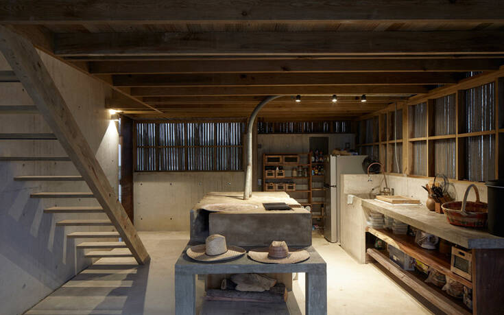Το ίδιο σκηνικό συναντάμε και εσωτερικά, που φέρνει σε οργανική αρμονία το γυμνό μπετό με τα φυσικά υλικά, όπως το χώμα και ο πηλός.