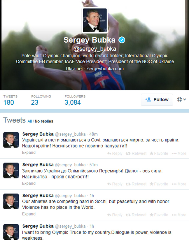 «Θέλω να φέρω την ολυμπιακή εκεχειρία στη χώρα μου», έγραψε στο Twitter, «ο διάλογος είναι δύναμη, η βία αδυναμία. Οι αθλητές μας αγωνίζονται σκληρά στο Σότσι, αλλά ειρηνικά και με τιμή. Η βία δεν έχει θέση στον κόσμο».
