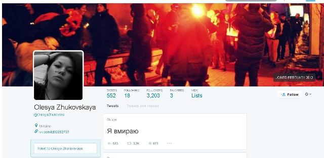 Συγκλονίζει η φωτογραφία που μοιράστηκε μέσω του twitter η εθελόντρια στην παροχή πρώτων βοηθειών Ολέσια Ζούκοφσκα, από την πλατεία Ανεξαρτησίας στο Κίεβο, όπου εμφανίζεται αιμόφυρτη ενώ έχει δεχθεί σφαίρα στο λαιμό από ελεύθερο σκοπευτή.