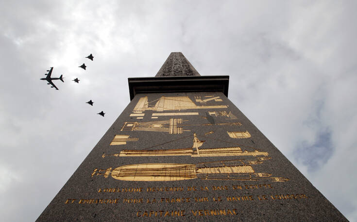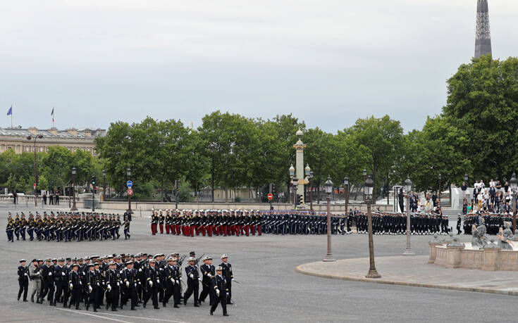 Επιβαίνοντας σε στρατιωτικό τζιπ, ο αρχηγός του κράτους έφθασε γύρω στις 10:45 (τοπική ώρα, 11:45 ώρα Ελλάδας) μπροστά στην εξέδρα που είχε στηθεί στην πλατεία Κονκόρντ, στο κέντρο του Παρισιού, όπου κάτω από έναν συννεφιασμένο ουρανό είχαν συγκεντρωθεί περίπου 2.000 στρατιωτικοί, οι μισοί απ’ ό,τι συνήθως, όπως περιγράφει το ΑΜΠΕ.