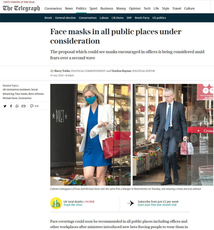 Να φορούν μάσκες σε όλους τους δημόσιους χώρους, όπως και στα γραφεία και σε άλλους χώρους εργασίας, ενδέχεται σύντομα να συστήσουν οι βρετανικές αρχές στους πολίτες, σύμφωνα με δημοσίευμα της εφημερίδας «The Telegraph».