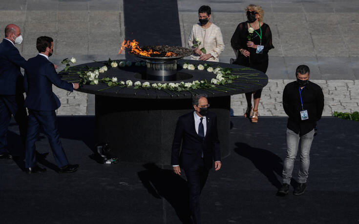 Οι συγγενείς των νεκρών άφησαν λευκά τριαντάφυλλα πάνω σε ένα ξύλινο μαύρο βάθρο, στο κέντρο του οποίου έκαιγε μια φωτιά.
