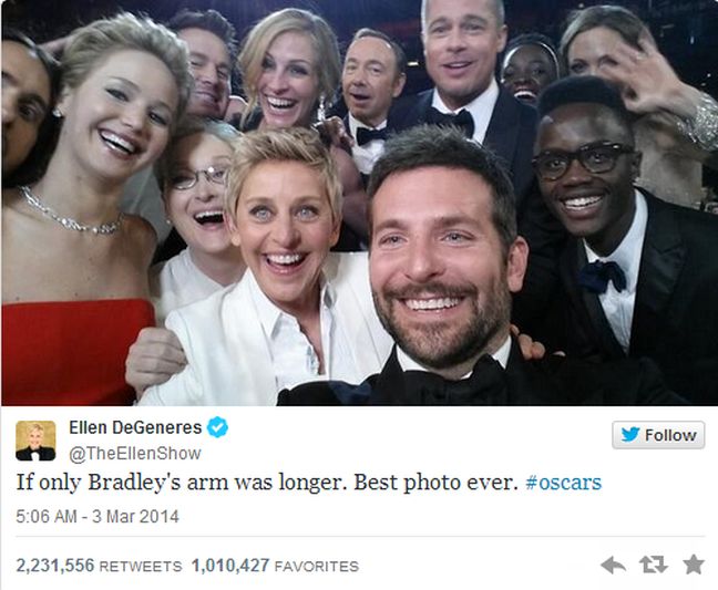 Η φωτογραφία ανέβηκε στο Twitter της παρουσιάστριας και έσπασε το ρεκόρ retweet (αναδημοσίευσης) αφού ξεπέρασε τα δύο εκατομμύρια και συνέτριψε το προηγούμενο, που ανήκε στον Μπαράκ Ομπάμα και την αγκαλιά του στη σύζυγό του, Μισέλ, μετά την επανεκλογή του έχοντας περίπου 780.000 retweets.