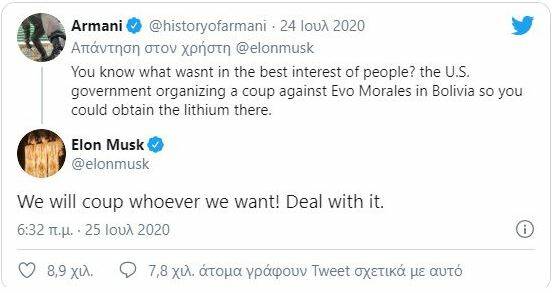 Ο Αμερικανός δημοσιογράφος πήρε θέση δημόσια σχετικά με το tweet του δισεκατομμυριούχου και χρησιμοποιώντας τον δικό του λογαριασμό στο twitter έγραψε: «ουσιαστικά πιστώνεται το πραξικόπημα για το λίθιο της Βολιβία»