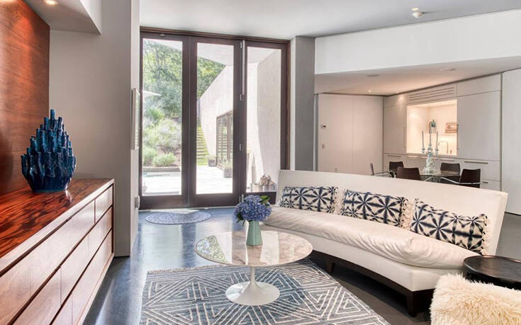 Οι υπόλοιποι κοινόχρηστοι χώροι βρίσκονται στην οριζόντια δομή στη βάση του κύβου, που προσφέρει εξίσου απλόχερη θέα στην πισίνα και τον κήπο των 1,36 στρεμμάτων.
