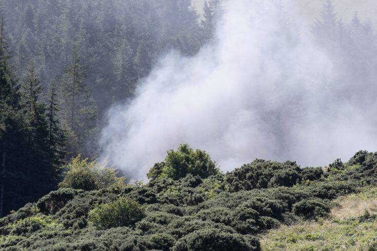 Μαύρος καπνός υψώνεται από μια δασική περιοχή στο τέλος της κοιλάδας κοντά στο Στοουνχέιβεν, νότια της πετρελαϊκής πόλης Αμπερντίν, μετά τον εκτροχιασμό του τρένου της ScotRail έπειτα από ισχυρές βροχοπτώσεις που σημειώθηκαν στη διάρκεια της νύχτας.