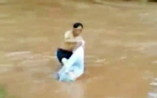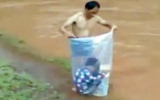 Έβαλε ένα- ένα τα παιδιά μέσα σε μία μεγάλη πλαστική σακούλα, για να τα προστατεύσει από το νερό και, κουβαλώντας τα, διέσχισε τον ποταμό με το νερό να του φτάνει ως το λαιμό.