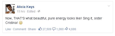 Μάλιστα, μεταξύ των «φαν» της είναι και η ίδιια η Alicia Keys, η οποία έσπευσε να εκφράσει τον ενθουσιασμό της για την αδελφή Κριστίνα μέσω του Facebook, ποστάροντας το σχετικό βίντεο.