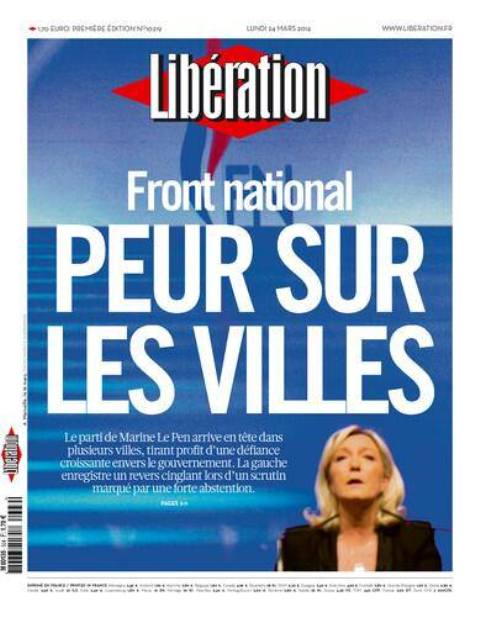 Με την φωτογραφία της επικεφαλής της ακροδεξιάς παράταξης, Μαρίν Λεπέν και τον τίτλο «Φόβος πάνω από τις πόλεις» στο πρωτοσέλιδό της κυκλοφορεί αύριο η γαλλική εφημερίδα «Liberation» μετά τα υψηλά ποσοστά που πήρε η ακροδεξιά σε πόλεις της Γαλλίας.