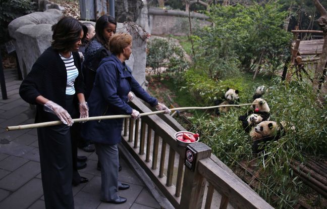 Η Μισέλ Ομπάμα έδειξε ιδιαίτερο ενδιαφέρον για την 22χρονη Λίλι, μια γιαγιά panda στην προστατευόμενη περιοχή της Τσενγκντού, την παγκόσμια πρωτεύουσα των panda, των ζώων που επισήμως θεωρούνται «εθνικοί θησαυροί» στην Κίνα. Παράλληλα, η Μισέλ γευμάτισε σήμερα σε ένα θιβετιανό εστιατόριο, όπου παράγγειλε σούπα με κρέας από γιακ.