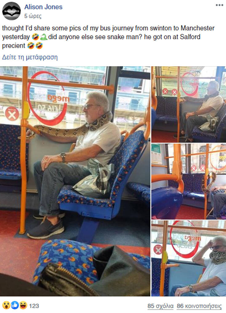 Όπως δήλωσαν στα τοπικά μέσα του Μάντσεστερ οι αυτόπτες, είχε τυλίξει το φίδι γύρω από τον λαιμό, προσέχοντας ώστε να καλύπτει στόμα και μύτη κατά την επιβίβασή του στο λεωφορείο από το Σουίντον.
