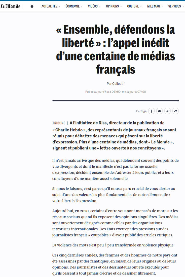 «Σήμερα, το 2020, ορισμένοι από εσάς απειλούνται με θάνατο στα μέσα κοινωνικής δικτύωσης όταν εκθέτουν ιδιαίτερες απόψεις. Μέσα ενημέρωσης χαρακτηρίζονται ανοιχτά στόχοι από διεθνείς τρομοκρατικές οργανώσεις. Κράτη ασκούν πιέσεις σε Γάλλους δημοσιογράφους ‘ενόχους’ επειδή δημοσίευσαν κριτικά άρθρα», αναφέρεται στο κείμενο αυτό με τίτλο «Μαζί, υπερασπιζόμαστε την Ελευθερία».