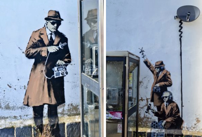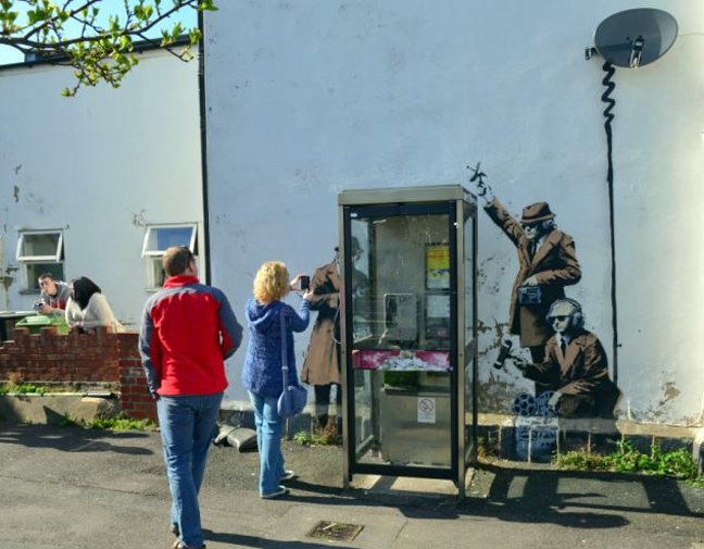 O μυστηριώδης Βρετανός street artist, Banksy παρουσίασε το τελευταίο του έργο σε τοίχο της πόλης Cheltenham. Το γκράφιτι, σύμφωνα με τη Daily Mail, που όλα δείχνουν ότι ανήκει στον καλλιτέχνη, απεικονίζει τρεις μυστικούς πράκτορες με καπαρντίνες, να παρακολουθούν τις τηλεφωνικές συνομιλίες γύρω από έναν τηλεφωνικό θάλαμο.