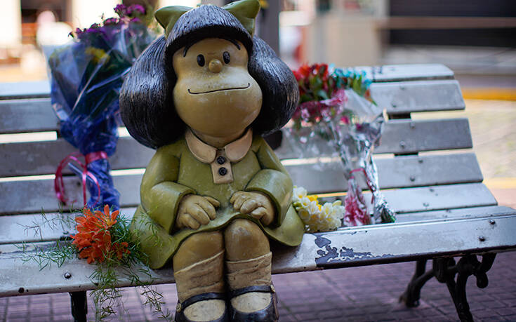 Το άγαλμα της Μαφάλντας, του κοριτσιού που μισεί τη σούπα και λατρεύει τους Beatles, κατακλύστηκε από λουλούδια, από αναγνώστες που πήγαν να τιμήσουν τον δημιουργό της στην ιστορική συνοικία Σαν Τέλμο, στο κέντρο του Μπουένος Άιρες.