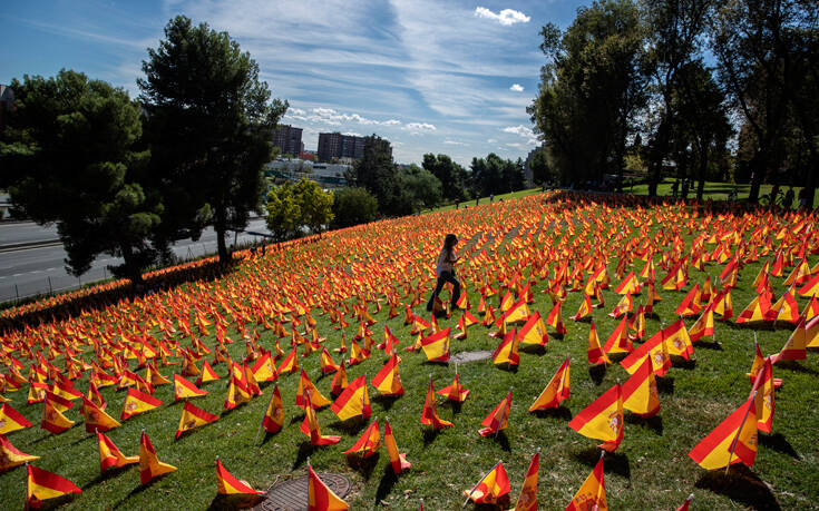 Ένας λόφος στη Μαδρίτη γέμισε με περίπου 53.000 σημαίες της Ισπανίας, οι οποίες «φυτεύτηκαν» εκεί ως… άλλα λουλούδια για να αποδώσουν φόρο τιμής στα θύματα της πανδημίας του κορονοϊού. Η χώρα της Ιβηρικής ήταν από αυτές που έπληξε περισσότερο ο ιός στην Ευρώπη και τα «σημάδια» έχουν μείνει έντονα χαραγμένα στην κοινωνία.