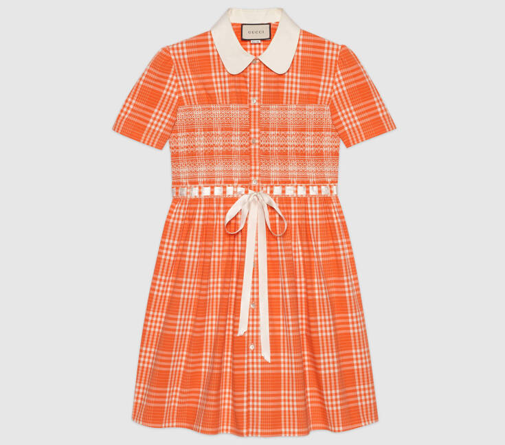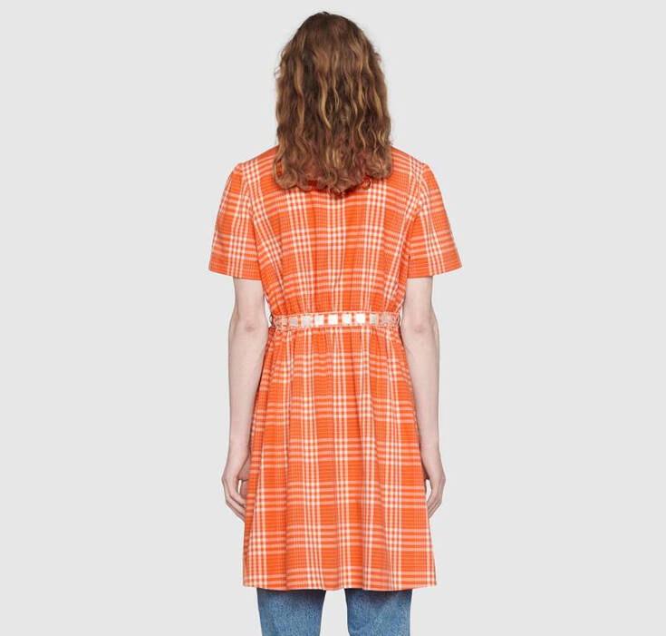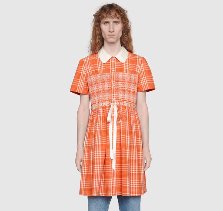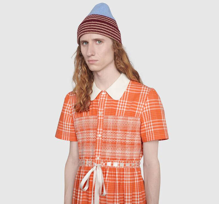 Ένα ωραιότατο αντρικό φόρεμα εμφανίστηκε στην ιστοσελίδα της Gucci, σε πορτοκαλί και μπεζ χρώμα και με εξίσου υπέροχο σατέν φιόγκο, ώστε να «καταστρατηγήσει τα τοξικά στερεότυπα και να πλάσει την αρρενωπή ταυτότητα φύλου».