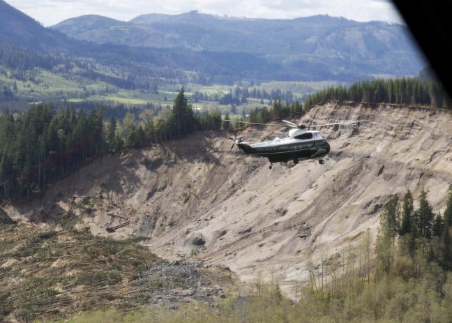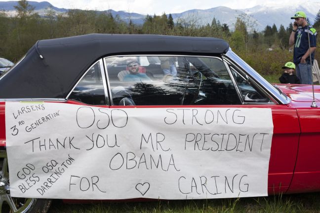 Ο Ομπάμα μεταφέρθηκε με ελικόπτερο πάνω από το σημείο όπου τόνοι λάσπης είχαν καλύψει την περιοχή και στη συνέχεια συναντήθηκε για πάνω από μία ώρα με τους συγγενείς των θυμάτων σε ένα μικρό εκκλησάκι.