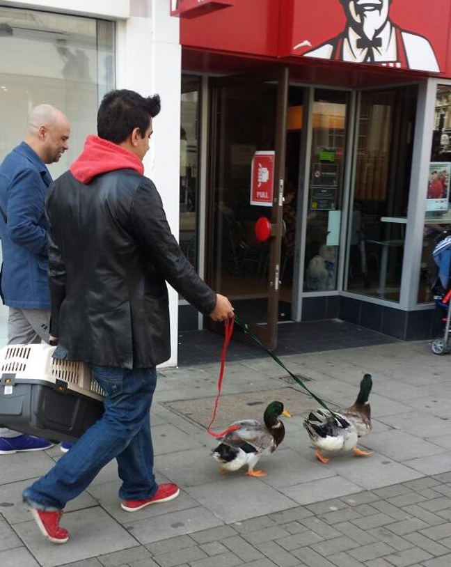 Έκπληκτοι έμειναν αρκετοί Λονδρέζοι όταν είδαν έναν νεαρό να περπατά στον πολυσύχναστο δρόμο της πόλης και αντί για σκύλο -όπως είναι το σύνηθες- να έχει βγάλει για περίπατο τις πάπιες του. Εκείνες περπατούσαν μπροστά του και ο άνδρας κρατούσε στο άλλο χέρι του ένα κλουβί όπου θα τοποθετούσε μετά τα κατοικίδια του.