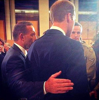 Κάτι παρόμοιο έκανε και ο νυν πρωθυπουργός Tony Abbott που φωτογραφιζόμενος με τον πρίγκιπα Γουίλιαμ, κατά τη διάρκεια της περιοδείας του σε Νέα Ζηλανδία και Αυστραλία, έβαλε το χέρι του στη μέση του.