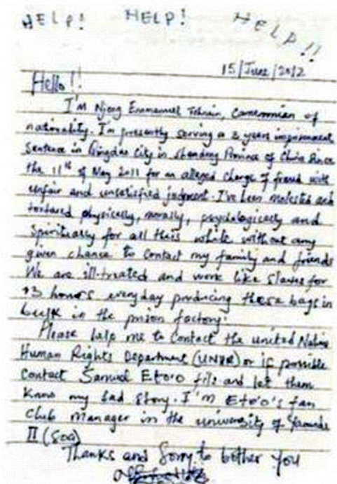 «Βοήθεια! Βοήθεια! Βοήθεια!», έγραφε η επιστολή που υπέγραφε ένας άνδρας ονόματι Tohnain Emmanuel Njong, συνοδεύοντάς το με μία φωτογραφία του και την ηλεκτρονική του διεύθυνση.