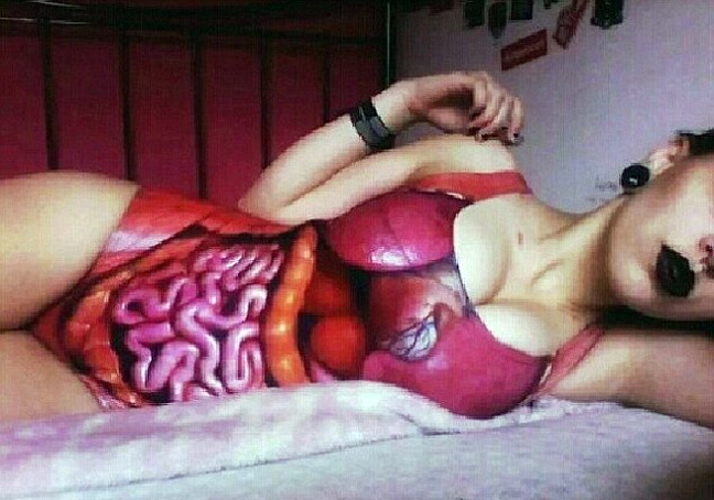 Αντί για άλλο σχέδιο το μαγιό έχει ζωγραφισμένα πάνω του ανθρώπινα όργανα, την καρδιά, τους πνεύμονες, το έντερο και μυϊκό ιστό.