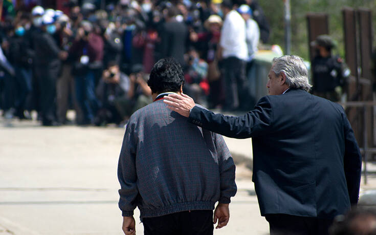 Ο Έβο Μοράλες συνοδευόταν όταν βρισκόταν στην πλευρά των συνόρων της Αργεντινής από τον κεντροαριστερά πρόεδρο Αλμπέρτο Φερντάντες, ο οποίος παρέστη χθες, Κυριακή, στην ορκωμοσία του νέου προέδρου σοσιαλιστή Λούις Άρτσε.