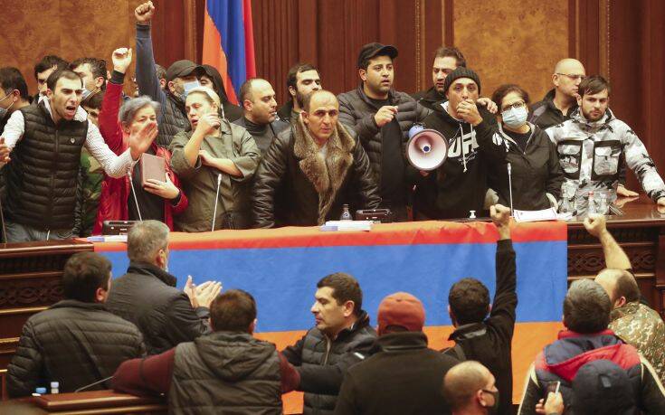 Η συμφωνία προκάλεσε έκρηξη οργής στο Γερεβάν, όπου χιλιάδες έξαλλοι διαδηλωτές αργά το βράδυ της Δευτέρας (09/11) πολιόρκησαν το κτίριο του Κοινοβουλίου με εκατοντάδες να εισβάλλουν και να προκαλούν εκτεταμένες φθορές.