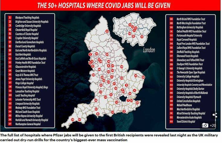 Όπως αναφέρει το δημοσίευμα, τα 13 νοσοκομεία από αυτά που θα παραλάβουν τις δόσεις βρίσκονται στην κεντρική Αγγλία, 8 είναι στα βορειοδυτικά, νοτιοανατολικά και νοτιοδυτικά, ενώ επτά είναι στην ανατολική Αγγλία και το Λονδίνο. Αντίθετα, μόνο ένα νοσοκομείο θα διαθέτει τις δόσεις στο Γιορκσάιρ στα βορειοανατολικά της χώρας.