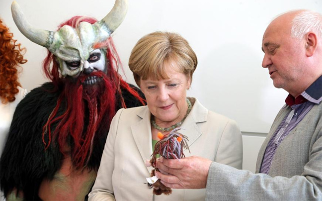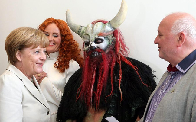 Το έργο παίζεται αυτές τις μέρες στο Βερολίνο, παρουσιάζοντας ένα υπαίθριο υπερθέαμα φαντασίας και ο θίασος βρέθηκε στο γερμανικό κοινοβούλιο για να κάνει… διαφήμιση της παράστασης. Η Μέρκελ συνομίλησε με τους συντελεστές του έργου και δεν τους αρνήθηκε όταν της ζήτησαν να φωτογραφηθούν μαζί τους. Που να ήξερε ότι στη μία από τις τρεις φωτογραφίες που δημοσίευσε η La Stampa θα έβγαινε… με κέρατα; Απλώς έτυχε εκείνη τη στιγμή να βρίσκεται ακριβώς από πίσω της ένας από τους ηθοποιούς, ο οποίος φορούσε μια μάσκα με κέρατα και αυτά μοιάζουν να βρίσκονται στο δικό της κεφάλι στο φωτογραφικό στιγμιότυπο.