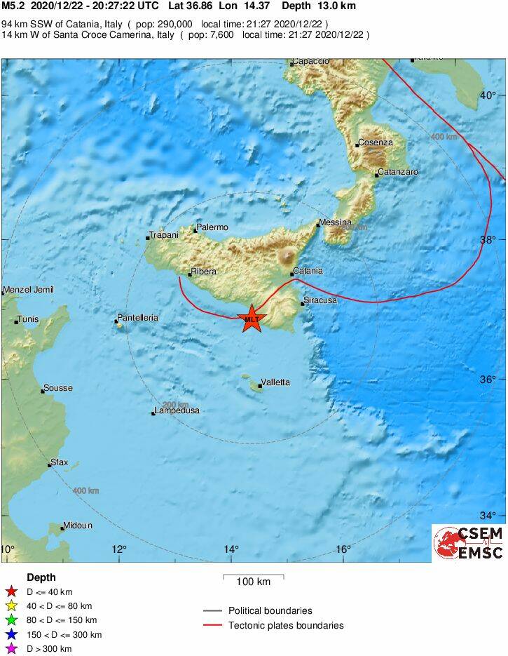 Δυνατός σεισμός σημειώθηκε πριν λίγα λεπτά στην Σικελία της Ιταλίας. Ο σεισμός είχε μέγεθος 4,8 Βαθμούς της Κλίμακας Ρίχτερ και το εστιακό του βάθος ήταν στα 30 χιλιόμετρα.