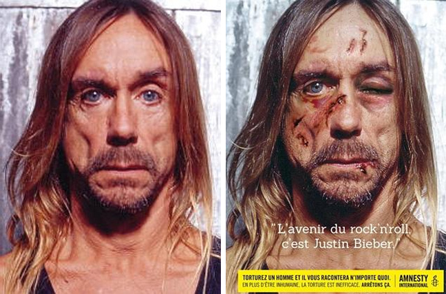 Κάτω από το πρόσωπο του Ίγκι Ποπ υπάρχει η δήλωσή του, στα γαλλικά: «Το μέλλον του rock ‘n roll είναι ο Τζάστιν Μπίμπερ».
