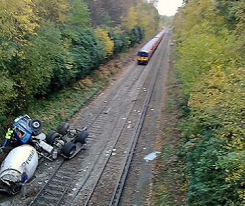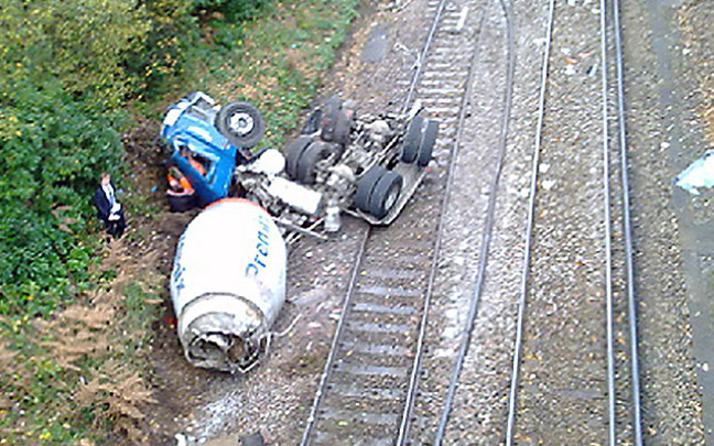 Πανικός επικράτησε όταν ο οδηγός μιας μπετονιέρας έχασε για άγνωστη μέχρι στιγμής αιτία τον έλεγχο του οχήματος, το οποίο αφού προσέκρουσε σε ένα πέτρινο τοίχο, έπεσε από μια γέφυρα στο κενό και προσγειώθηκε σε γραμμές τρένου.